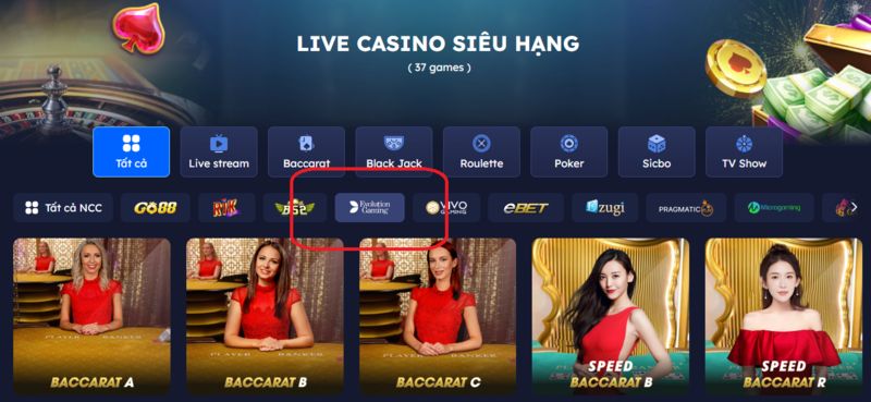 - Bước 3: Trên giao diện chọn mục Live Casino, click nhà cung cấp yêu thích, vào bàn cược và bắt đầu trải nghiệm hấp dẫn.